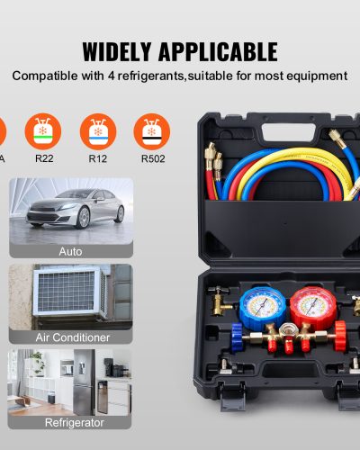 VEVOR AC Gauge Set – 3 Way AC Manifold Gauge Set For R134A R22 R12 R502 Refrigerant, Freon Gauges With 5ft Hoses, Couplers, Can Tap Works On Car Auto Freon Charging And Evacuation
