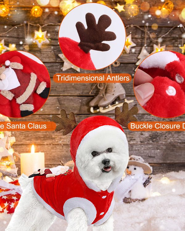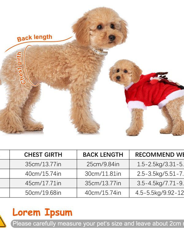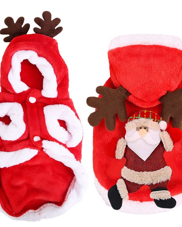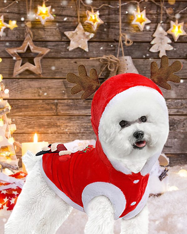 - *Classic Christmas Design*:Why don??t you let your furry friend get involved in cheerful Christmas atmosphere? Our pet clothes are designed with classic color matching,cute Santa Claus pattern and tridimensional antlers,you pet will be the most attractive and stylish one when you take it for a walk or party.
