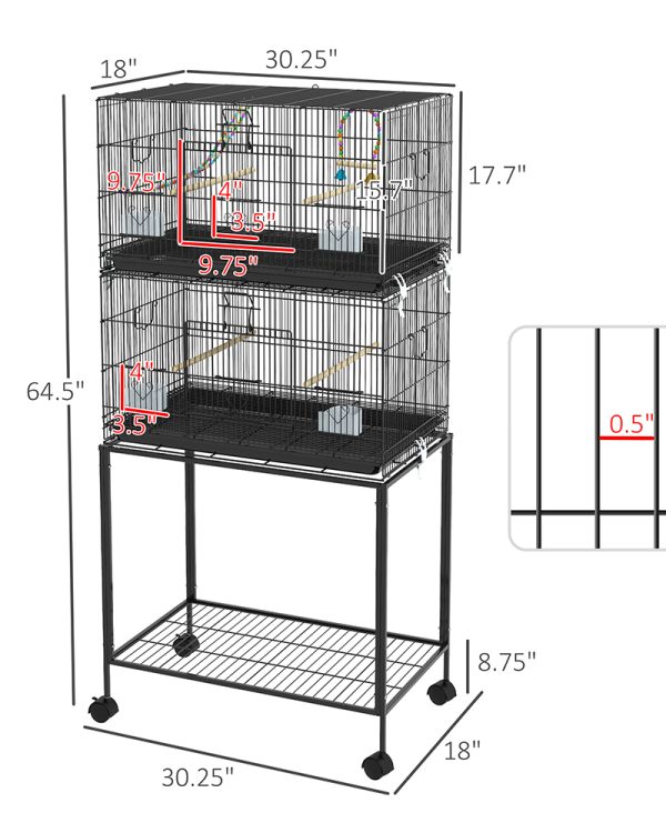 - – Large Bird Cage Info: Overall Dimensions: 30.25″ L x 17.75″ W x 64.5″ H. Each Tray Dimensions: 29.25″ L x 17.75″ W x 1.25″ D. Assembly required. Suitable for small parrots, such as budgies, lovebirds, and small birds of the finch family, such as canaries. Bar Spacing: 0.5″ W.