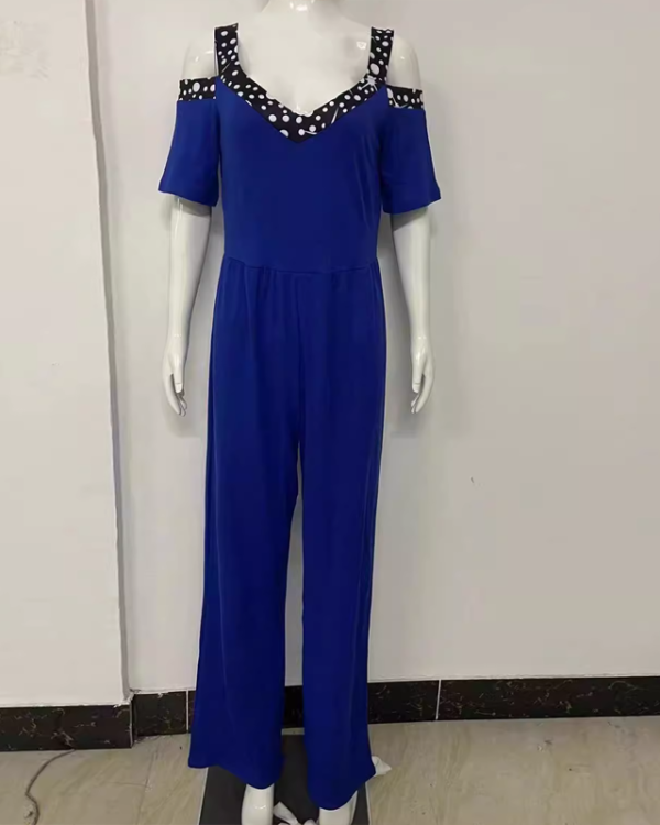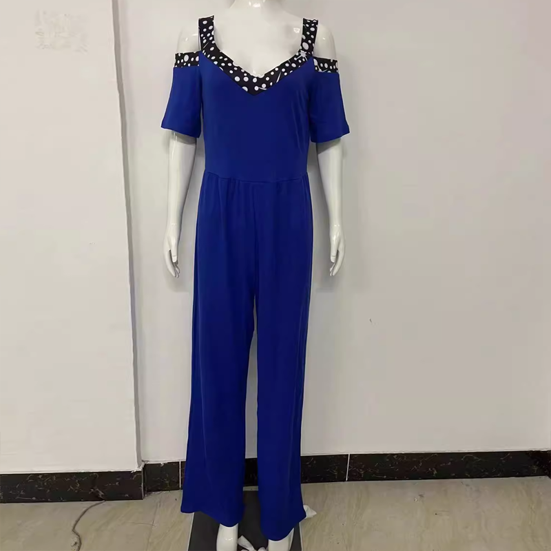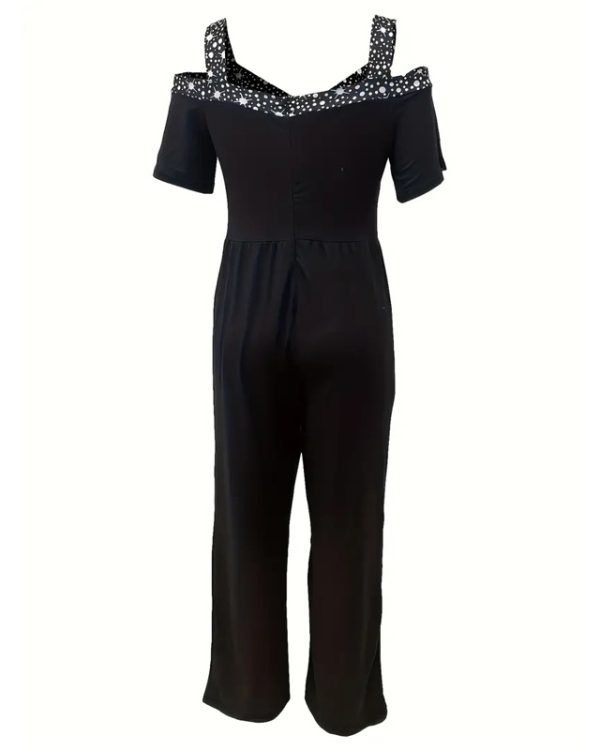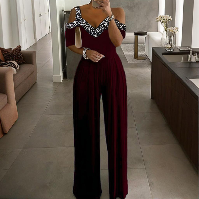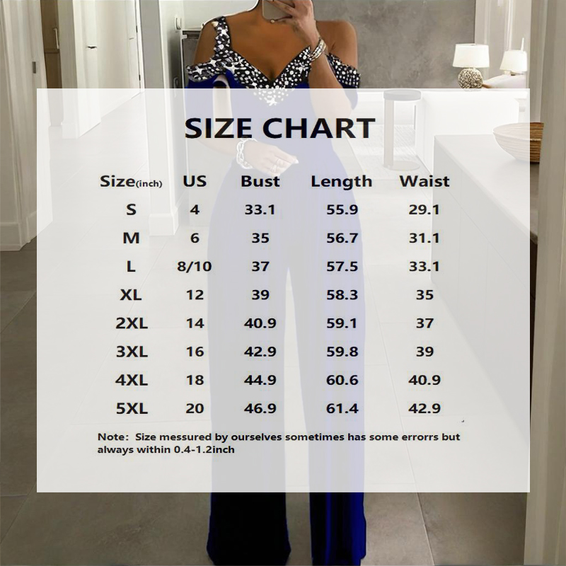 Designed for plus size figures, this sophisticated one-piece features a flattering V-neckline adorned with sparkling rhinestone detailing that catches the light beautifully. The wide leg silhouette flows gracefully from the fitted bodice, creating a elongating effect that flatters every curve. Crafted from 95% polyester/5% spandex, this jumpsuit offers comfortable stretch and exceptional drape, ensuring all-day comfort. The adjustable tie waist allows for customizable fit, while the ankle-length design maintains polished sophistication. Available in extended sizes S-5XL to ensure the perfect fit.