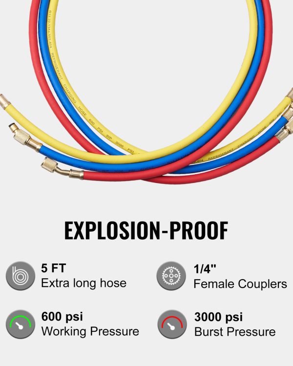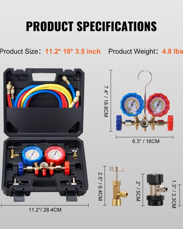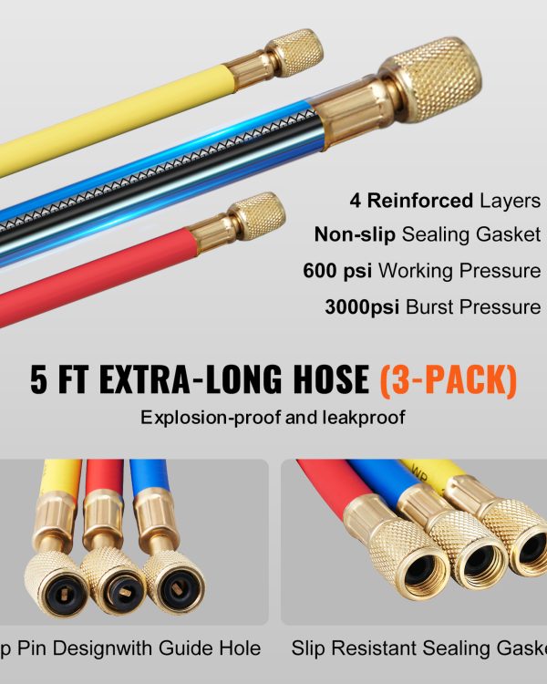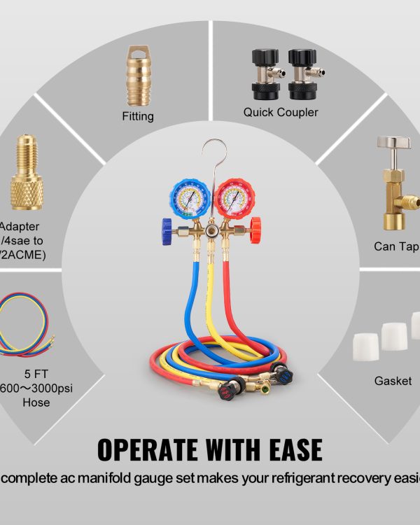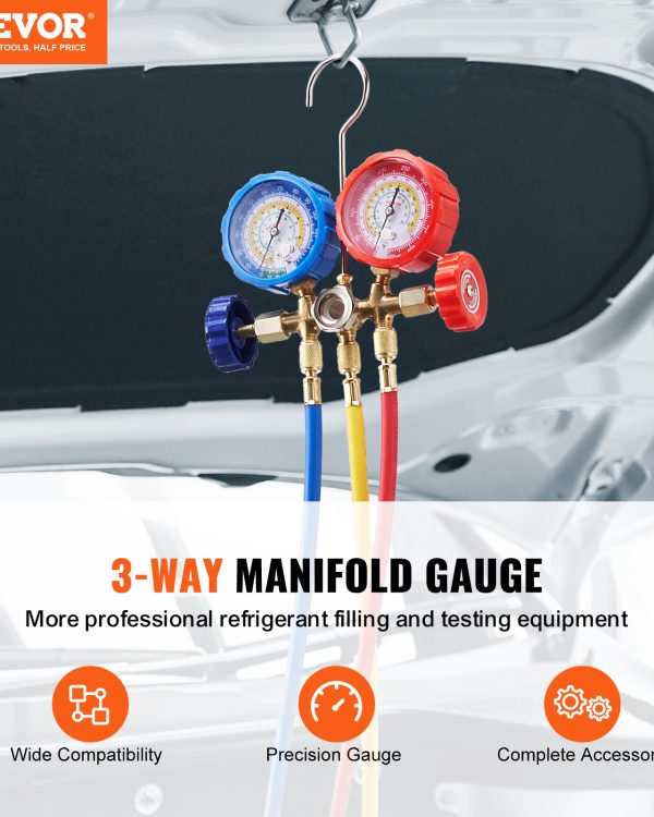 VEVOR AC Gauge Set – 3 Way AC Manifold Gauge Set For R134A R22 R12 R502 Refrigerant, Freon Gauges With 5ft Hoses, Couplers, Can Tap Works On Car Auto Freon Charging And Evacuation